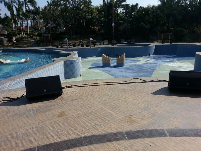 普宁盘龙湾温泉度假村是一家高档的五星标准度假村酒店, 其室外露天温泉广场, 功能集演出娱乐于一体. 灯光及音响配套要求较高, 项目由广州市悦霸音响设备有限公司设计施工并使用我司合资控股的美国品牌VXNXA威雷音响产品, 本次技术团队选用威雷VXNXA系列线阵音响, 采用威雷VXNXA LA-312全频音箱及VXNXA威雷LA-8028线阵超低音箱组成阵列, 灯光采用悦霸WSKS沃斯卡的光束摇头灯,染色灯, 帕灯 ,镭射灯等产品, 大堂背景音乐及广播则由我司COOMOOC科曼的广播设备产品一展风采。