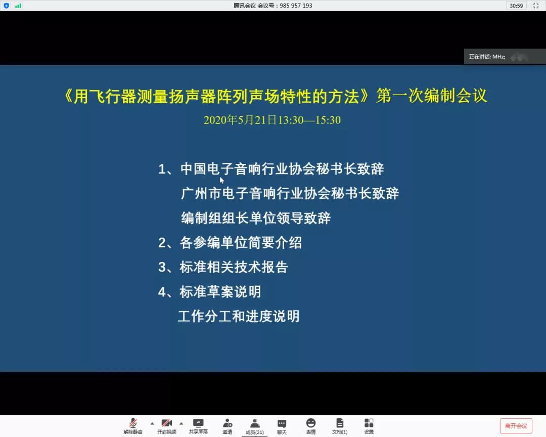 【又讯】 2020年5月21日下午,由广州飞达音响股份有限公司和中国传媒大学牵头,中国电子音响行业协会和广州市电子音响行业协会共同推动制定的《用飞行器测量扬声器阵列声场特性的方法》团体标准编制组首次会议顺利召开。
