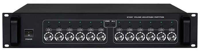 3、12路分区控制输出,每路分区音量可独立控制,互不干扰,每路分区最大输出功率为100W
